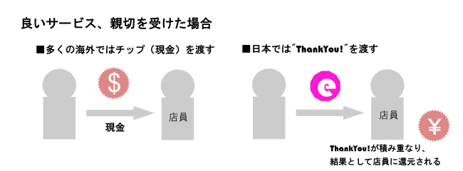 感謝の気持ちを表す電車で席を譲ってもらった、道を教えてもらったなど他人から何らかの親切を受けたときにチップを渡す感覚で「ThankYou!」を贈ってみましょう。店員さん以外の誰にでも「ThankYou!」を贈ることができます。
