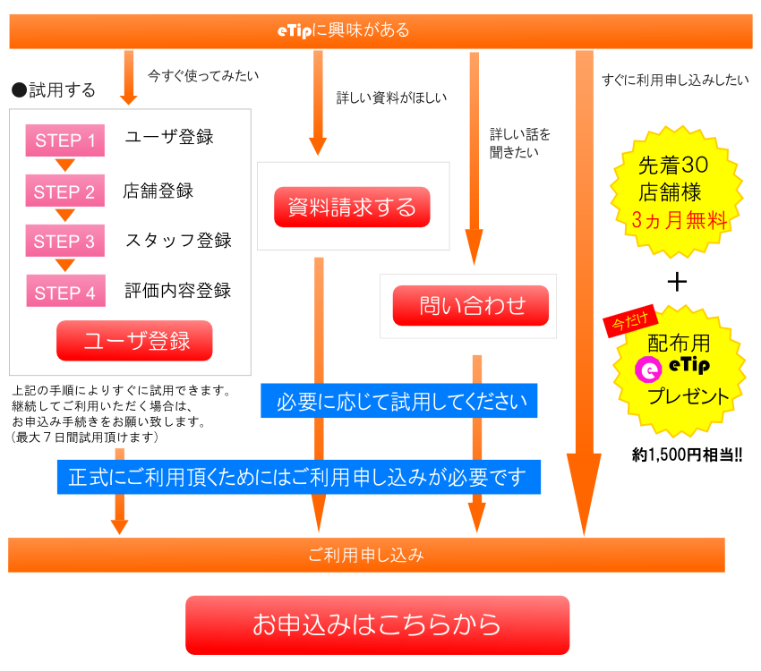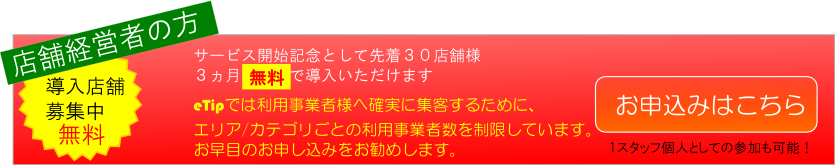 eTipホームページで店舗名が表示されます。 また、評価する際に自動的に付与されるeTipとは別に、 eTipクーポンを独自に配布したり(*)、eTip割引を実施したり、 eTipを活用した販促活動を行うことができます。その結果として、新規顧客の 集客を行うことができます。 (*)配布するクーポンは別途ご購入頂く必要があります。