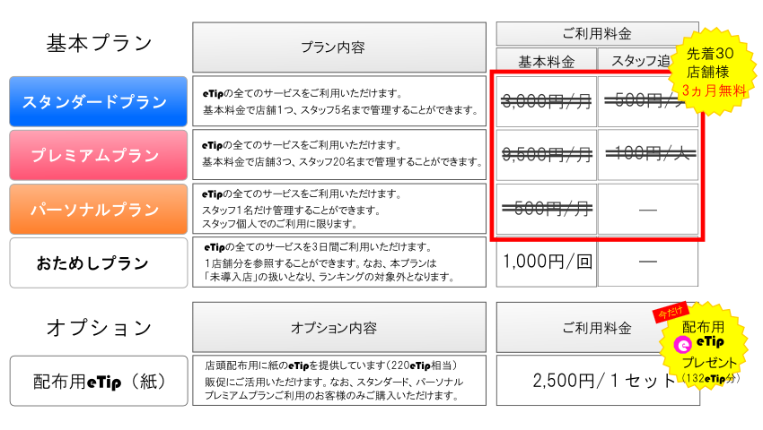 店舗が独自にeTip(紙のチケットとなります)を顧客に配布することができます。